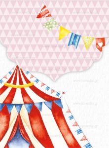 Προσκλητήριο με  θέμα το τσίρκο, με ζέβρα, ελέφαντα και αερόστατο.