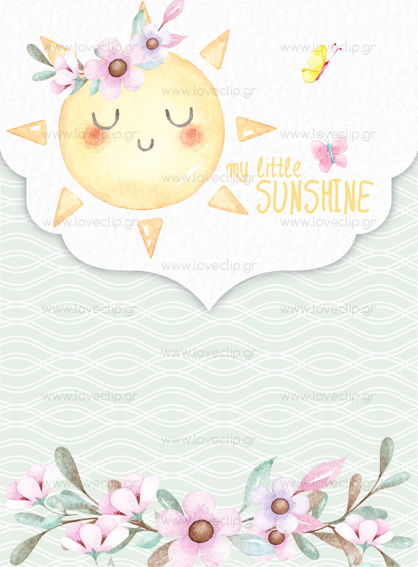 Προσκλητήριο με  θέμα τον ήλιο, με συνεφάκια, ουράνιο τόξο και φλοράλ διακόσμηση.