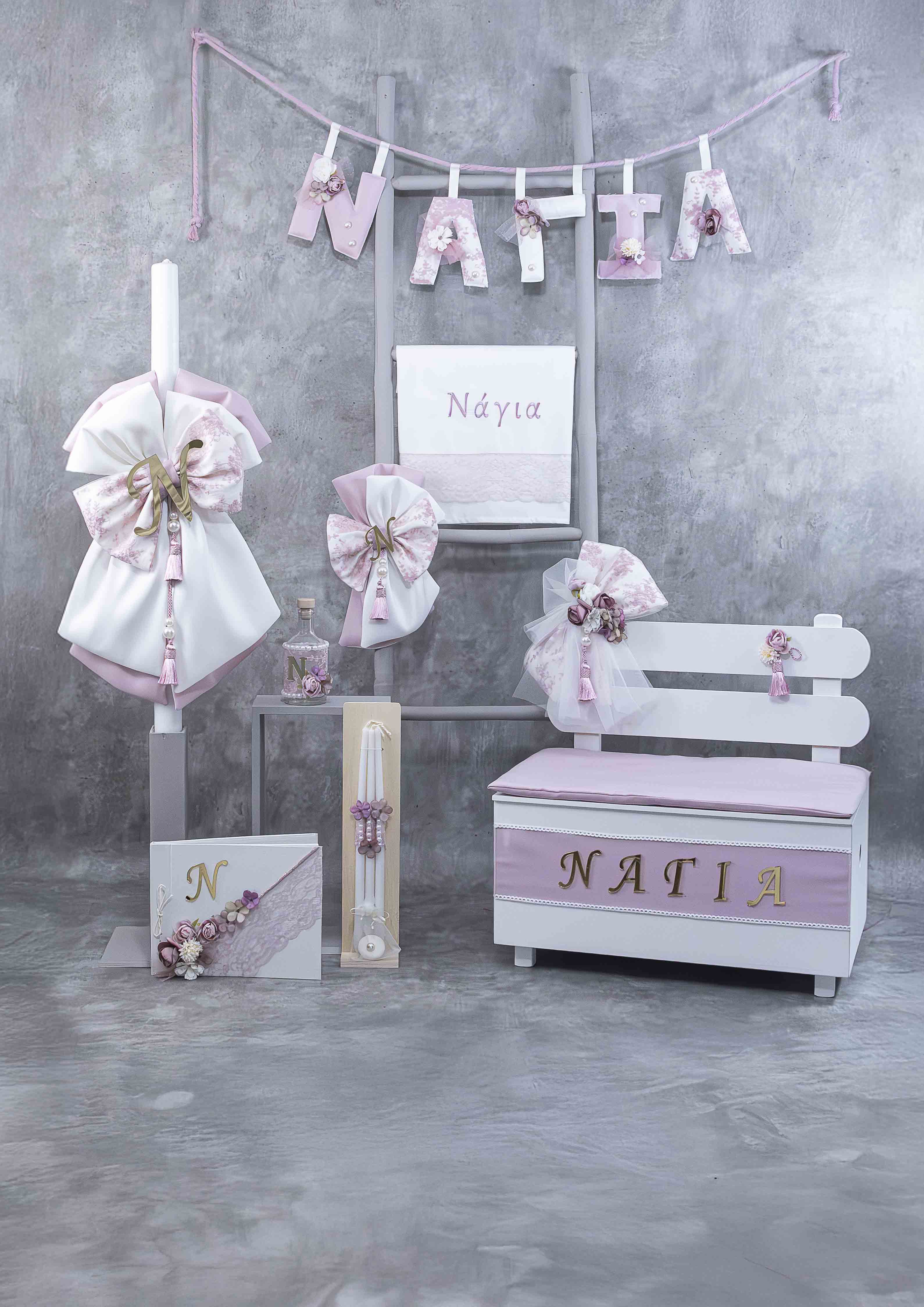 Το σετ περιλαμβάνει κουτί βάπτισης, βαλίτσα ή ψάθινη τσάντα, ανάλογα με το στυλ που επιθυμείτε, τα οποία μπορούν να χρησιμοποιηθούν τόσο για τη μεταφορά των βαπτιστικών όσο και ως όμορφο διακοσμητικό στοιχείο στο παιδικό δωμάτιο.